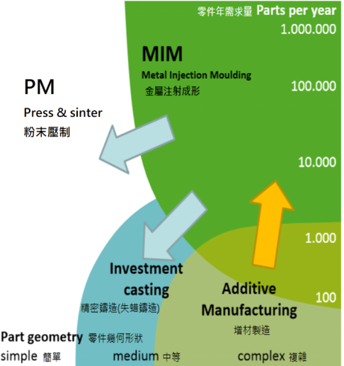 圖7.MAM的最新微米級3D打印5. PM/MIM/MAM工藝的產(chǎn)出能力答:如圖8非常淺顯易懂的表示三個工藝的產(chǎn)出能力特色。PM僅能制作中度復雜特征,但能制作大件/量大的訂單;MIM可以制作復雜特征產(chǎn)能很大,但是重量不大;MAM則是數(shù)量不多,但制品的重量和復雜度都沒有限制。特別是MIM原本僅是取代精密鑄造(Investment casting, 又稱熔模鑄造、失蠟鑄造或脫蠟鑄造),但是逐漸有侵入老大哥PM的領(lǐng)域,未來會更加大零件重量與尺寸的制造能力。