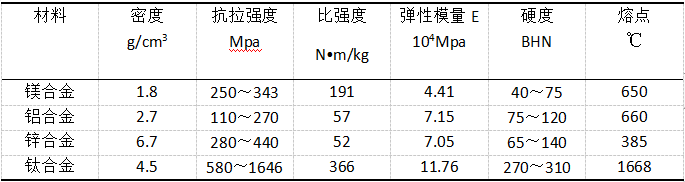 對于消費(fèi)類產(chǎn)品而言,常用的合金材料有鋁合金、鋅合金和鎂合金。鈦合金由于其生物相融性好,常用在醫(yī)療領(lǐng)域。歸納性的總結(jié)先放在前面,見以下性能表。